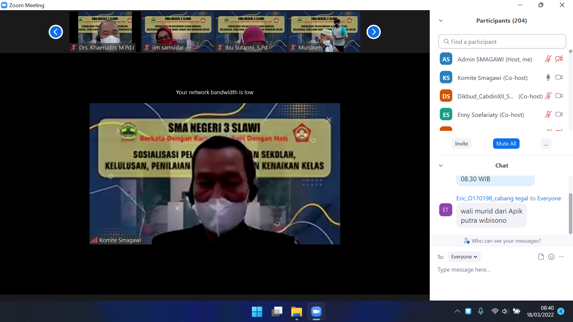 Selanjutnya ialah informasi dan pengarahan dari kepala sekolah. Bpk Masduki, S.Pd., M.Pd. selaku Kepala SMAN 3 Slawi menyampaikan pesan kepada segenap orang tua agar mendampingi putra-putrinya selahi Ujian Sekolah mengingat Ujian Sekolah dilaksanakan dalam bulan Ramadhan. Orang tua diimbau mengawal kondisi fisik dan asupan gizi bagi putra-putrinya agar tetap terjaga. Selain itu, jangan membiarkan siswa belajar kebut semalam karena masih ada waktu satu pekan untuk menyiapkan diri agar hasil ujian maksimal.