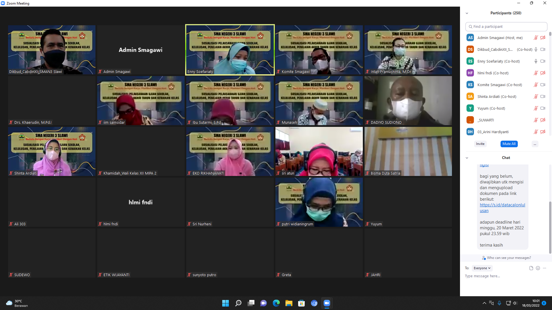 Pada Jumat, 18 Maret 2022 diadakan temu virtual antara pihak sekolah dengan orang tua siswa XII SMAN 3 Slawi. Kegiatan dilakukan secara virtual melalui platform digital zoom meeting. Agenda Kepala Sekolah Menyapa kali ini berfokus pada persiapan Ujian Sekolah tahun 2022 yang sedianya dilaksanakan pada akhir Maret 2022.