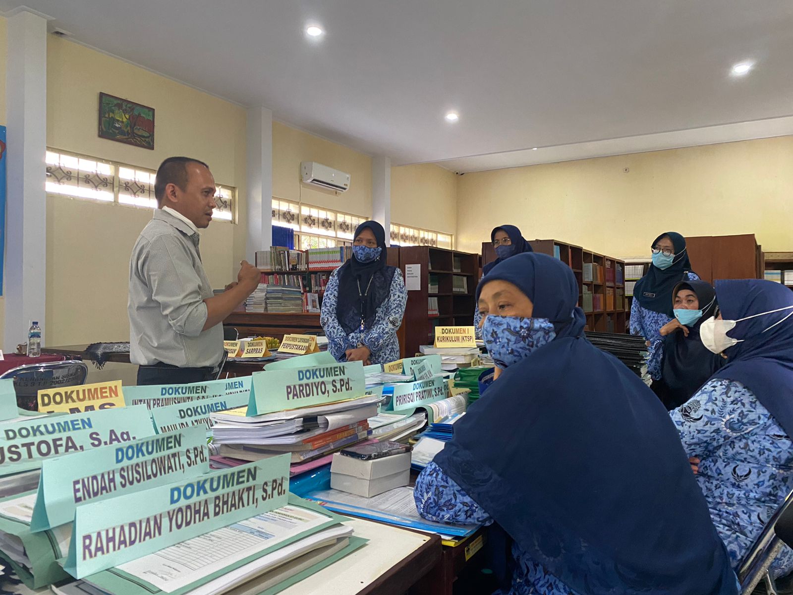 Selanjutnya kegiatan dilakukan di Perpustakaan SMAN 3 Slawi untuk melihat bukti perangkat SKS dan bertatap muka secara langsung baik dengan wali kelas, guru mapel, dan siswa SKS. Acara langsung dibuka oleh Bpk Masduki, S.Pd., M.Pd. selaku Kepala SMAN 3 Slawi. Beliau menyampaikan terima kasih kepada Tim Monev yang telah mendampingi SMAN 3 Slawi dari awal pencanangan hingga proses berjalannya SKS selama 3 tahun terakhir.