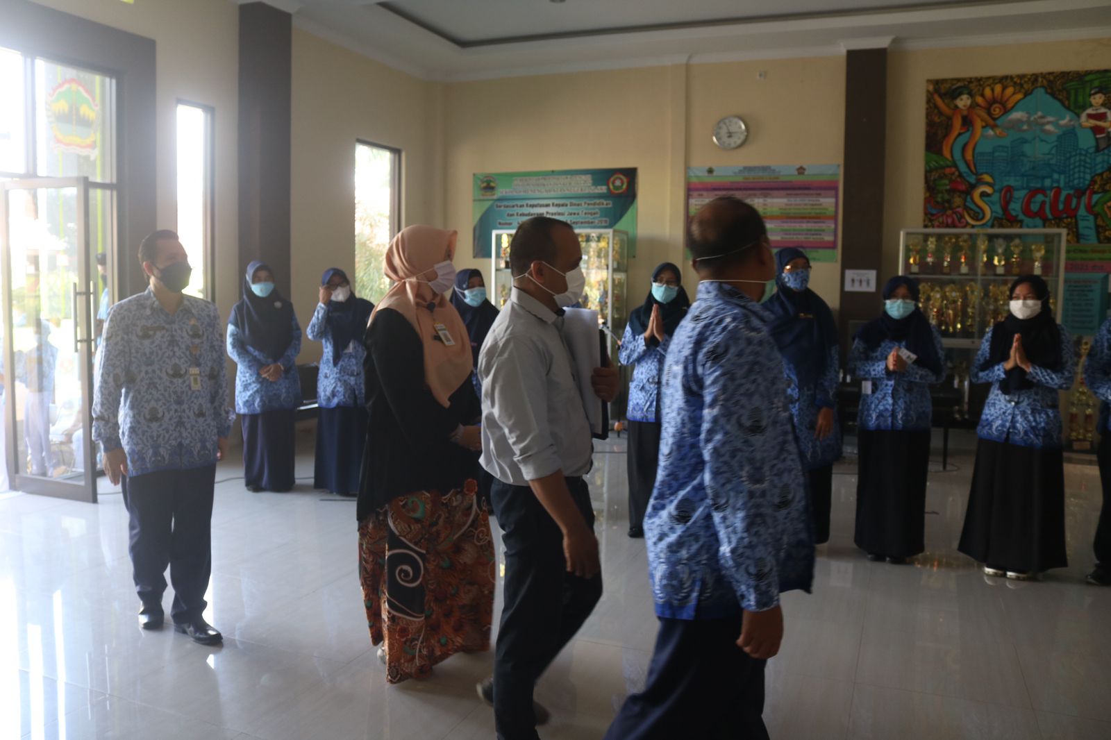 Tim Monev sampai di SMAN 3 Slawi sekira pukul 14.15 WIB. Sesampainya di sekolah, Tim Monev disambut oleh tampilan siswa-siswa SMAN 3 Slawi berupa hadrah, lagu, pantun, _speech_, serta pembacaan puisi. Selain itu, Tim Monev juga disajikan hasil karya siswa yang dipajang di bagian _hall_ sekolah. Sajian ini merupakan bentuk sambutan kepada Tim Monev atas capaian siswa yang telah mengikuti pembelajaran dengan sistem SKS.