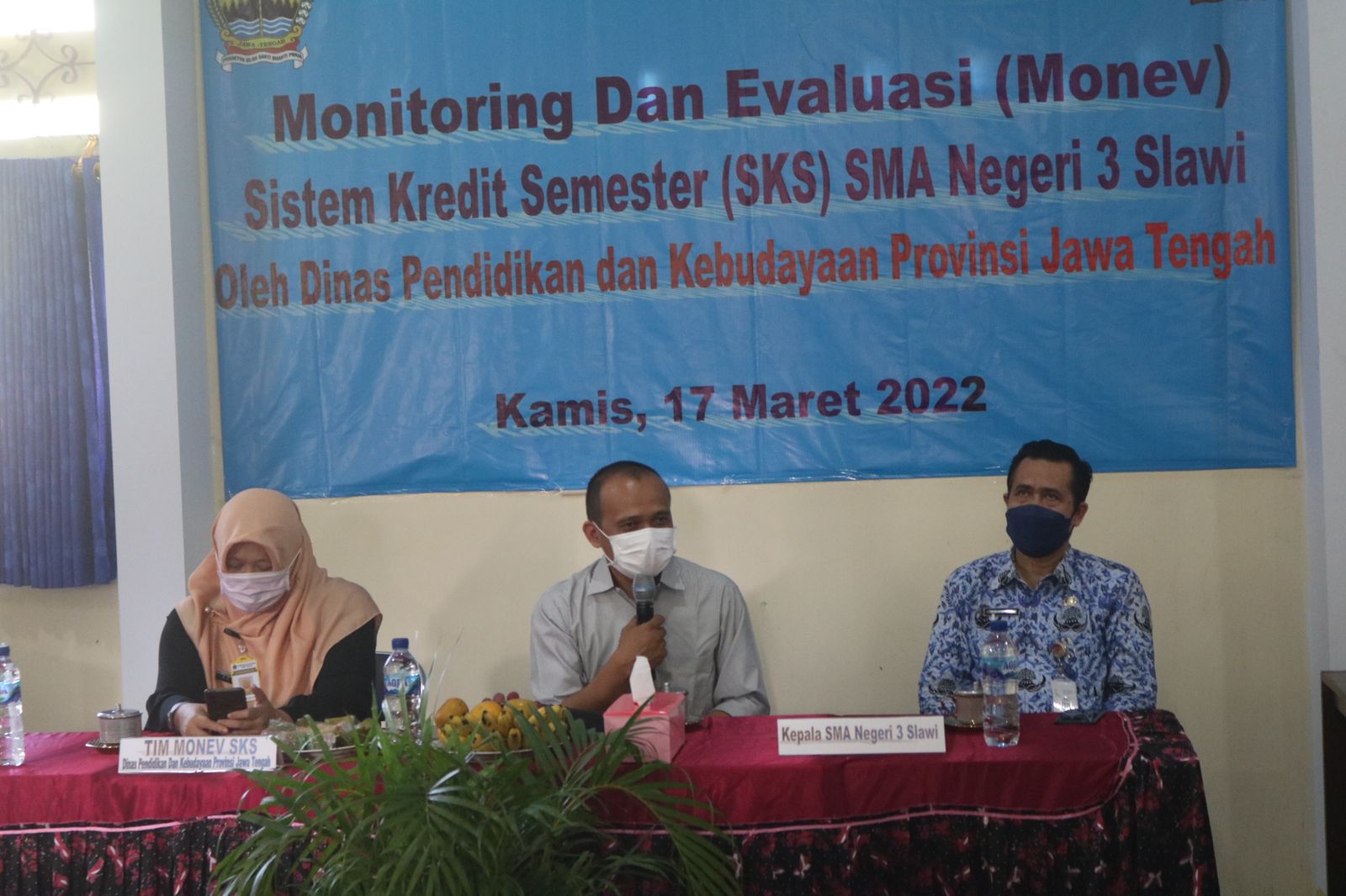 Kamis, 17 Maret 2022 telah dilaksanakan Monitoring dan Evaluasi (Monev) Sistem Kredit Semester (SKS) SMA Negeri 3 Slawi oleh Dinas Pendidikan dan Kebudayaan Provinsi Jawa Tengah. Adapun perwakilan tim Monev SKS dari pihak Dikbud Provinsi Jateng terdiri atas 2 personel, beliau Bapak Heru Susanto, S.Kom. dan Ibu Sri Endah Setyarini, S.Pd., M.Si.. Tim Monev SKS merupakan salah satu pencetus dilaksanakannya SKS di SMA Negeri di Jawa Tengah.