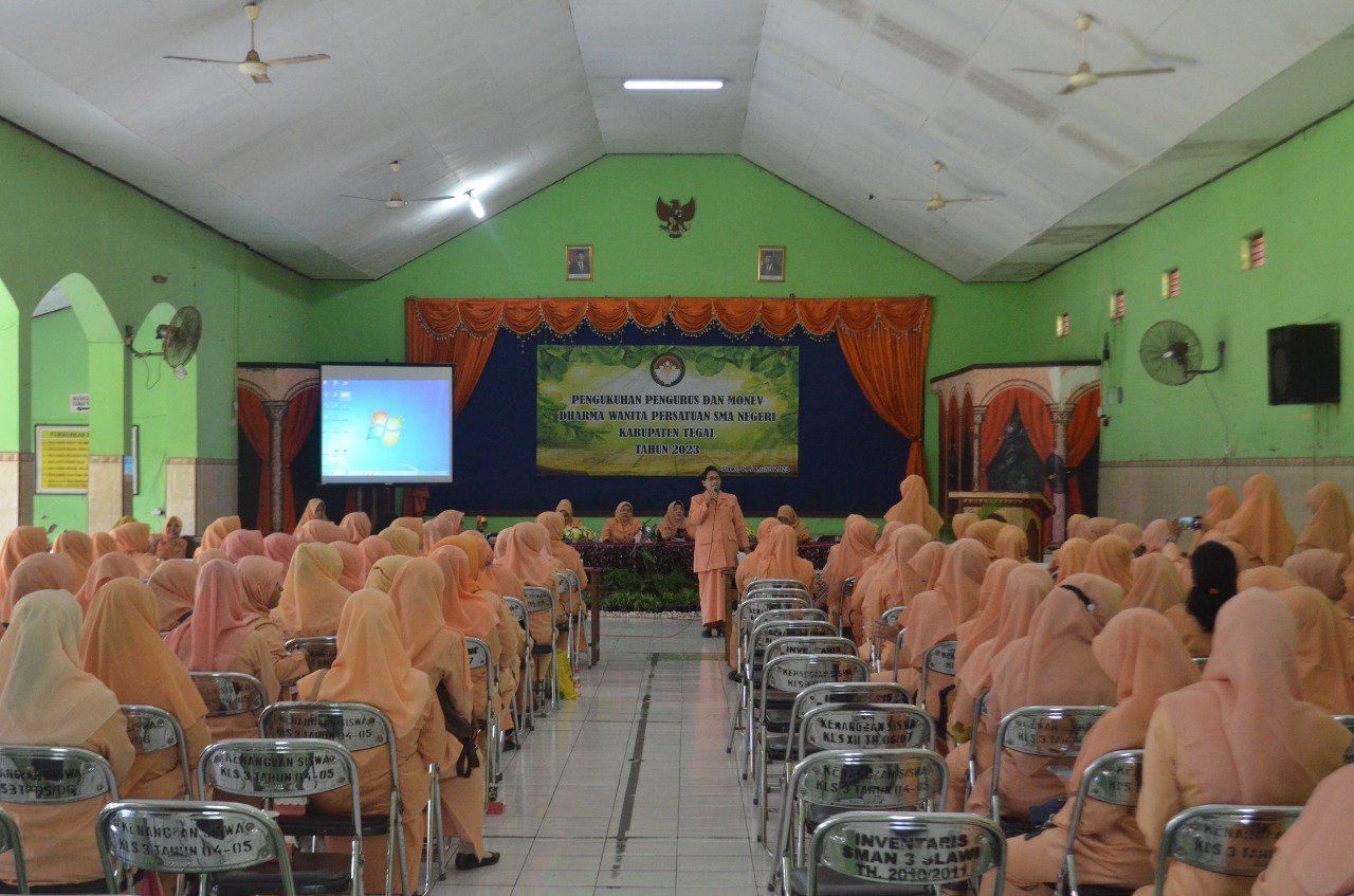 Pengukuhan Pengurus Dharma Wanita Persatuan SMA Negeri Kabupaten tegal tahun 2023 secara resmi telah di laksanakan di Aula SMA Negeri 3 Slawi, 9 Januari 2023 secara langsung oleh Ketua DWP Kabupaten Tegal Ny.Hj. Alfiyah Akhmad Was'ari.