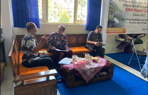 Selasa (10/1) dilaksanakan verifikasi kelayakan penyelenggaraan SKS SMAN 3 Slawi. Verifikasi merupakan upaya yang dilakukan Dinas Pendidikan dan Kebudayaan Provinsi Jawa Tengah untuk melakukan periksa pada tiap sekolah yang menyelenggarakan SKS. Adapun verifikasi dilakukan melalui 2 cara, visitasi dan unggah dokumen. Tim visitasi diwakili oleh Bpk Budi Raharja, S.Pd. selaku pengawas pembina SMA Kabupaten Tegal. Untuk unggah dokumen dilakukan dengan mengirimkan berkas file melalui laman yang telah disampaikan dalam edaran.